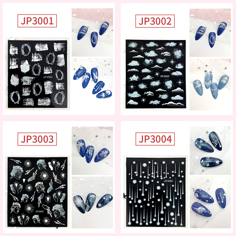 JP3001-3018 Nail Stickers, 18 designs avialable.MOQ 100 sheets.please kindly choose the design number(s) when you order,thank you.